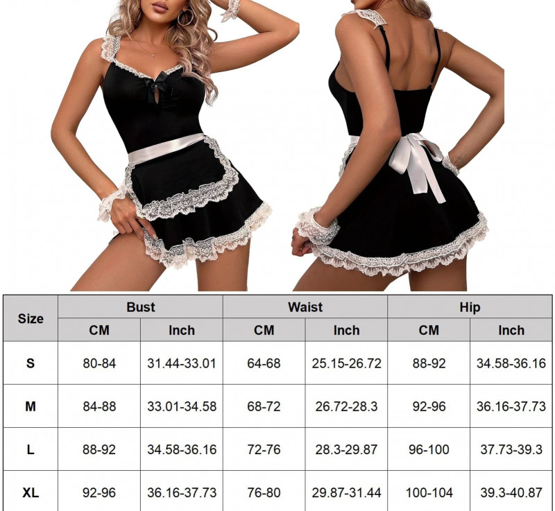 Идеальное сочетание черного и розового цветов придают наряду сексуальность и утонченность. Костюм состоит из эротичного просвечивающегося платья с розовым передником.Для того,чтобы образ имел завершенный вид, его дополняют утонченные черные перчатки с розовой вставкой, воротничок и головной убор.В анфас наряд выглядит как платье, а вот сзади он полностью оголяет спину и напоминает скорее юбку.